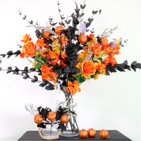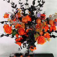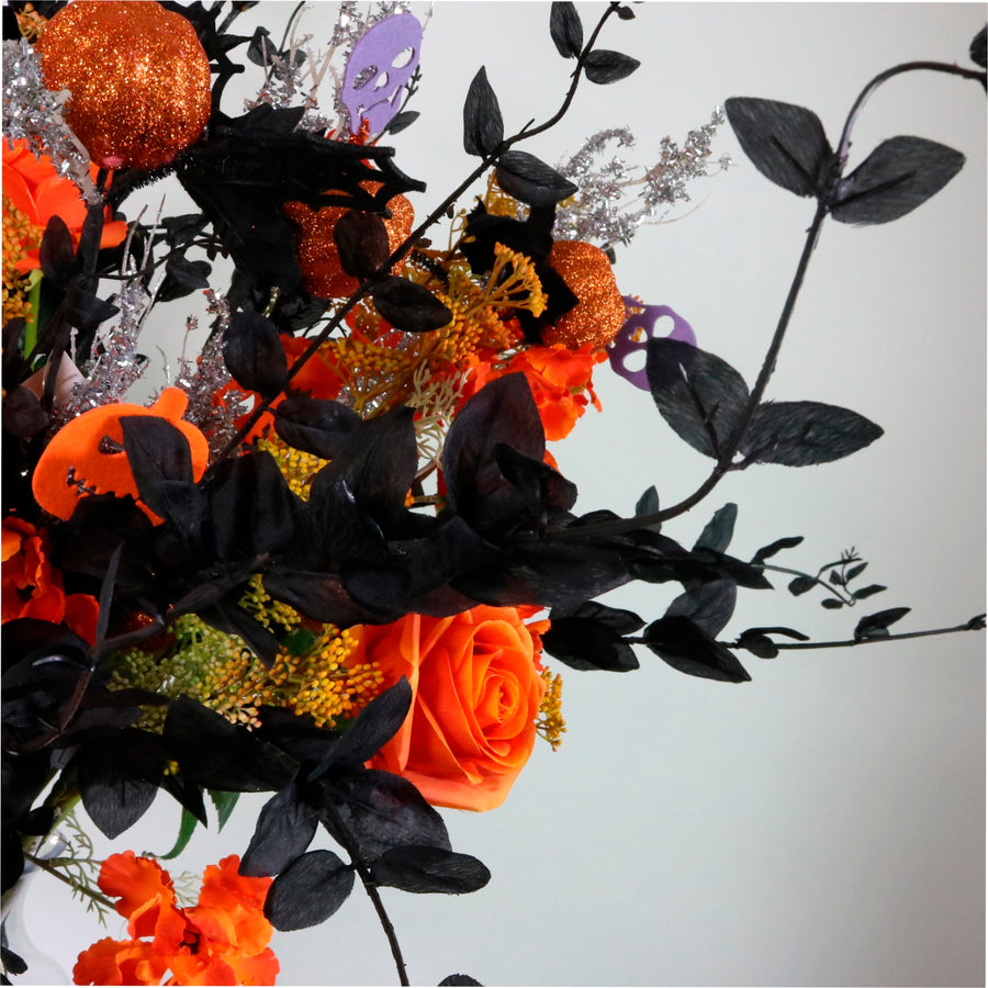 Start with Black Leaf Spray for a shadowy foundation, layer in Halloween Stems, Mini Buds, and Frilly Poppies for texture, and let the Harper Roses shine front and centre. The orange-and-black contrast creates a classic Halloween statement piece.