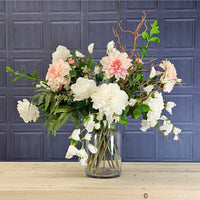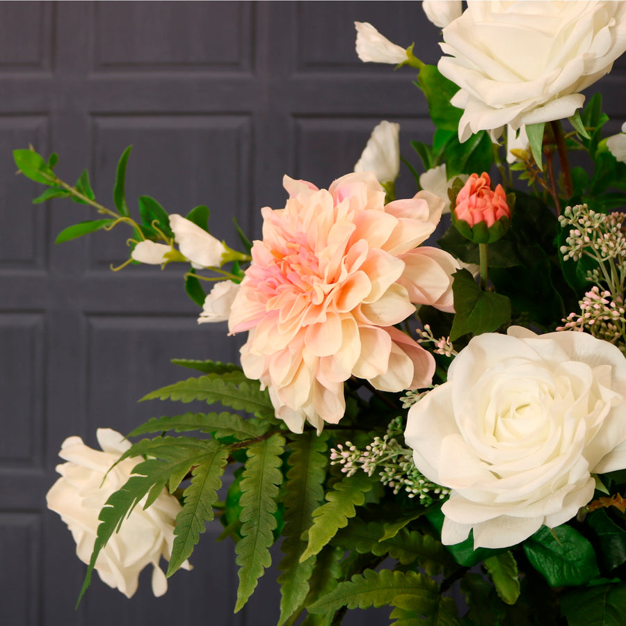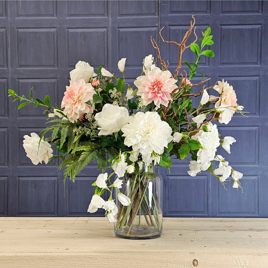 A sophisticated, freeform design, showcasing delicate real touch blooms and graceful foliage for a naturally elegant display.