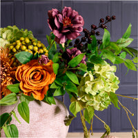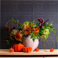 Focal Flowers – Nestle in the Hydrangeas so they sit just above the filler, grouping them in odd numbers for a relaxed, garden-inspired feel. Add Tudor Rose blooms throughout for romantic dimension, then tuck Fuji Mum low to anchor the design and bring cheerful texture. This combination of lush blooms and whimsical accents finishes the look with seasonal elegance.