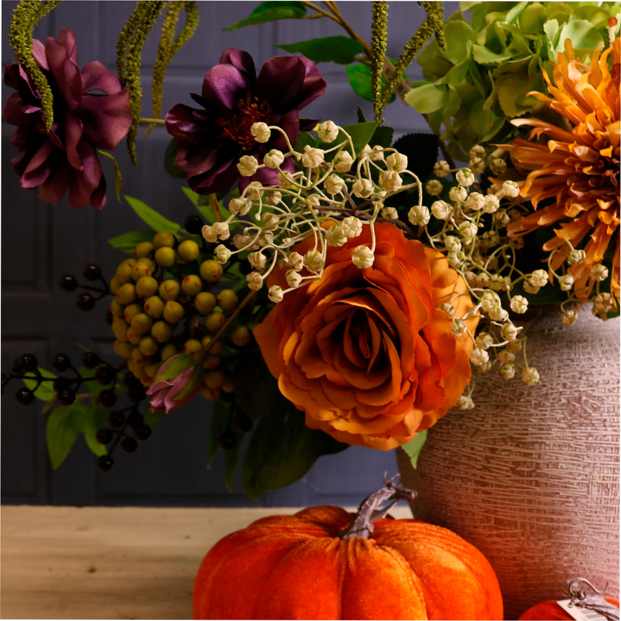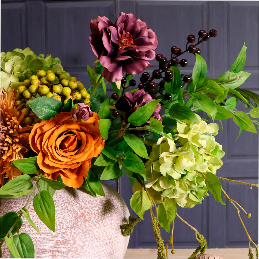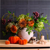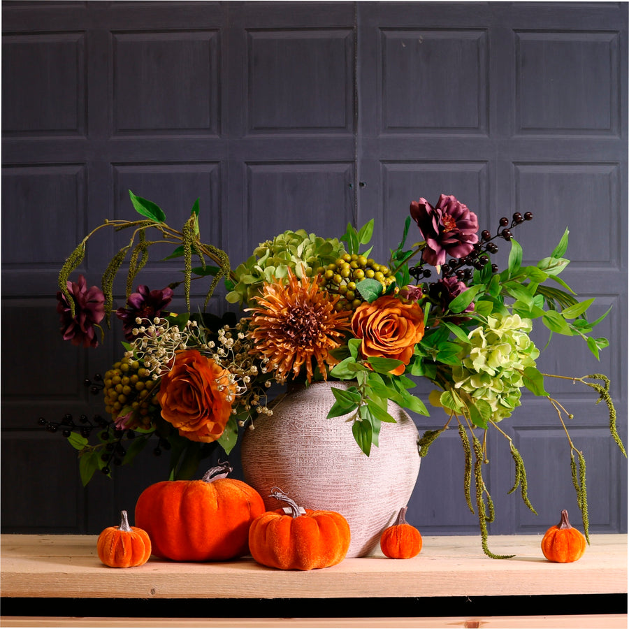 A warm, textured arrangement that layers seasonal foliage with whimsical accents for a naturally abundant, garden-ready look.
