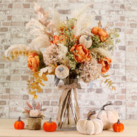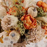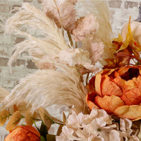 A warm cosy mix, this autumn arrangement layers airy Pampas with plush seasonal accents for a softly structured, harvest-ready look.