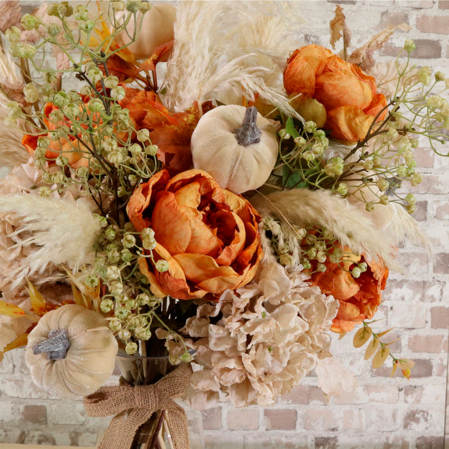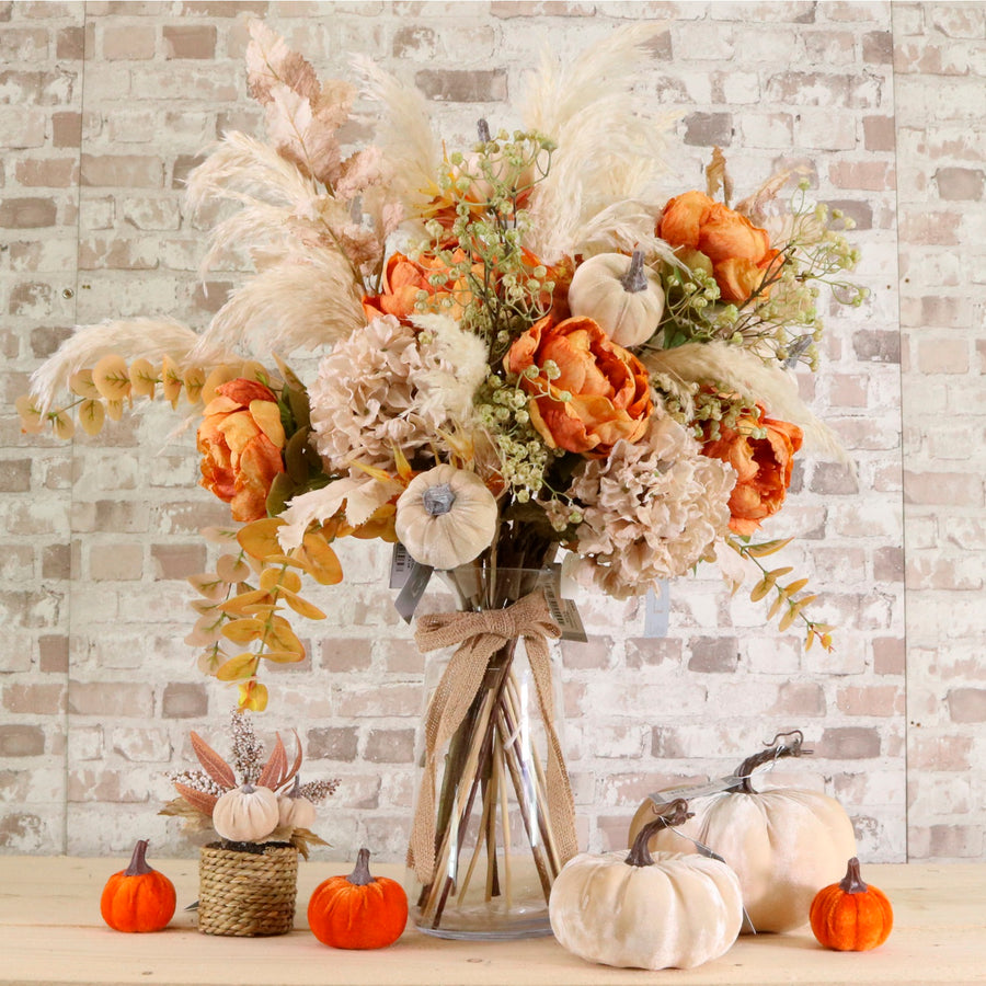 - Focal Flowers – Nestle in the Soft Peonies so they sit slightly above the filler, grouping them in odd numbers for a relaxed, garden feel. Tuck the Velvet Pumpkins low and close to the heart of the design, as if they’ve ripened right in the arrangement. This contrast of plush pumpkins and romantic blooms finishes the look with a rich, autumnal focal.